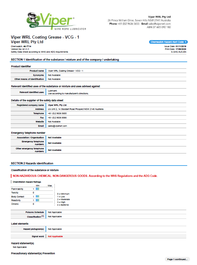 Material Safety Data Sheets VIPER WRL ECO ROPE GUARDIAN ERG-1 VIPER WRL COATING GREASE VCG-1 VIPER WRL PENETRATING GREASE VPG-0